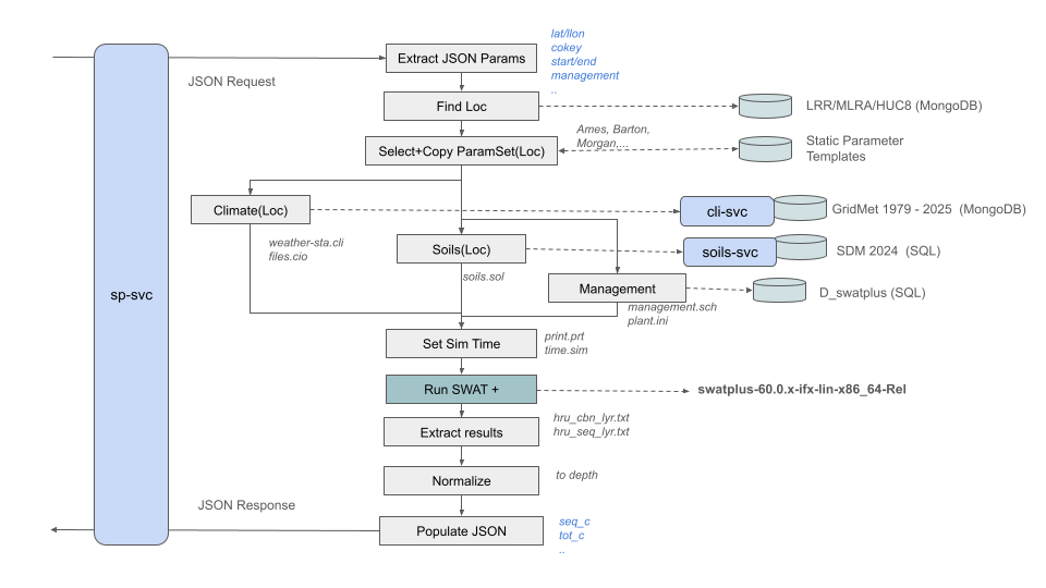The service creates input files for each soil component specified in the request, including bulk density, water holding capacity, soil texture, pH, organic matter, percolation, and other required parameters. The service processes the management object to files and formats needed for the model. It updates other model input files on the fly, reflecting field conditions. Finally, the service feeds the inputs to the SWAT+ model, running simulations for each valid soil component in the field.