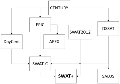 Figure 1 shows a simplified view of the model’s pedigree. SWAT+ inherited the stable SWAT2012 model, and obtained the soil organic carbon code from SWAT-C (Zhang et al. 2013), which in turn originated from code from the CENTURY and EPIC models.