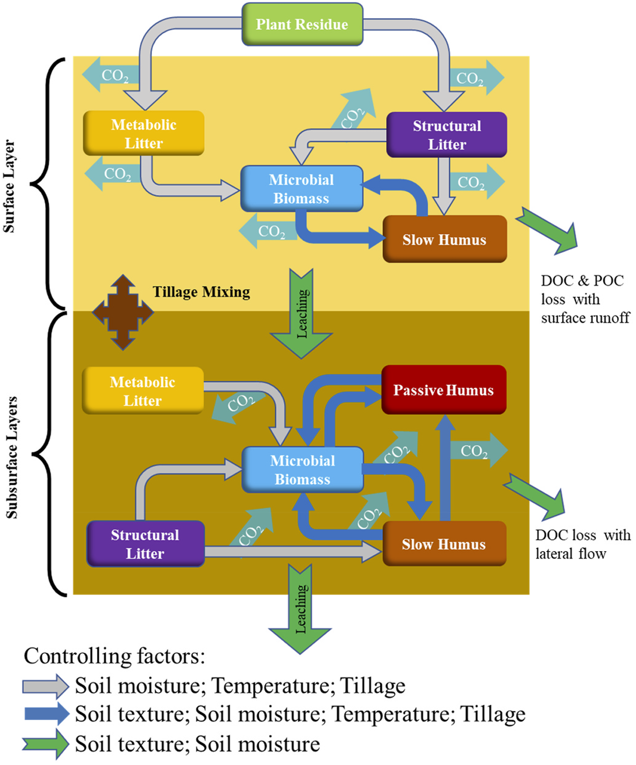 The passive humus carbon pool contains 40-50% of sequestered carbon in the soil, highly resistant to decomposition, persisting in the soil for hundreds of years, consisting of highly processed organic matter from long-term microbial activity, chemically complex, tightly bound to clay minerals or metal oxides. A relatively small fraction of carbon input reaches the passive humus pool, accumulating very slowly, but can be degraded through intensive tillage or other extreme disturbance. The passive humus pool has a maximum (very slow) decomposition rate (hp_rate) controlling its stability, adjusted by tillage, soil moisture, and temperature effects, N demand and supply to produce a potential and then daily site-specific actual transformation rate. Transformed slow pool emits as CO2 (the rate controlled by the apco2 parameter), the remainder returning to the microbial carbon pool.